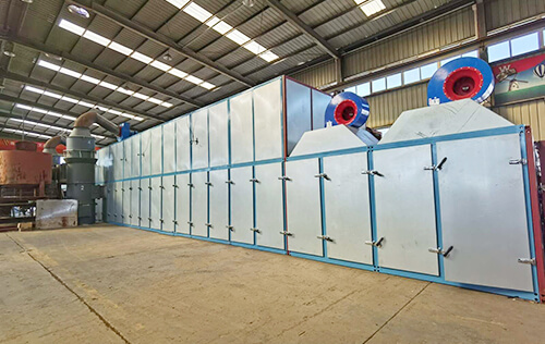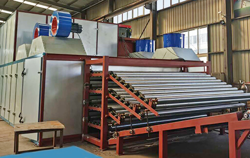 3、燃燒的尾氣溫度應在210度以上,利用此溫度經過除塵設備後直接送到各個運轉輥筒內,使各個輥筒的溫度達到170度左右,當水板喂進輥筒內,此時的水板表麵水分經過加熱輥筒時會迅速蒸發,也給單板縮短了預熱過程,使烘幹效果再次大幅度提升。